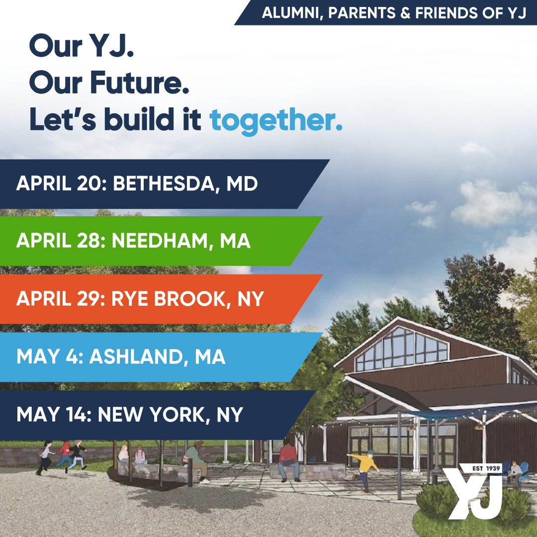 Join Camp YJ for a series of special gatherings bringing together alumni, parents, and friends of YJ. With events taking place at many different locations, each evening offers an opportunity to learn more about our Capital Campaign, celebrate the remarkable progress to date, hear about our newly launched Chai Society, and explore the exciting vision ahead.