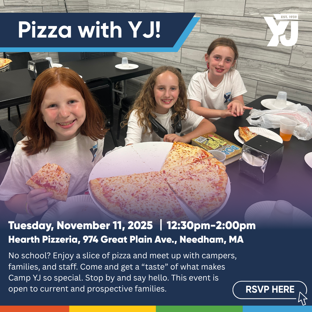 12:30pm-2:00pmNo school? Enjoy pizza and meet up with campers, families, and staff. Come and get a “taste” of what makes Camp YJ so special. Stop by and say hello. Open to current and prospective families.